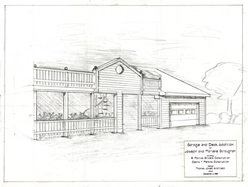 The proposal was for a new deck tied to the back of the existing house and connected to a new garage on the end. A hot tub was to be located behind the pediment and a door located at the garage attic for storage.